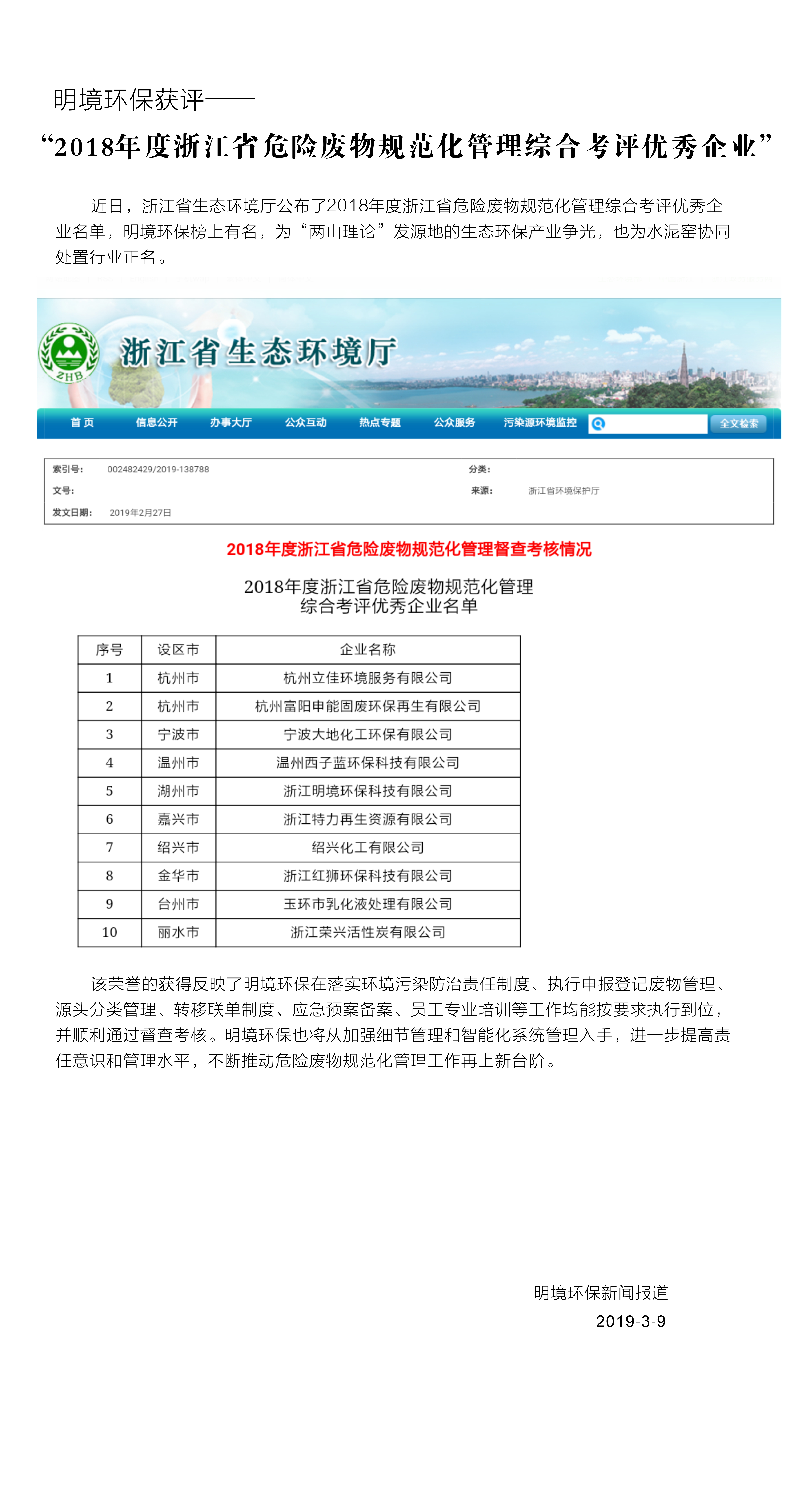 明境環(huán)保獲評(píng)“2018年度浙江省危險(xiǎn)廢物規(guī)范化管理綜合考評(píng)優(yōu)秀企業(yè)”
